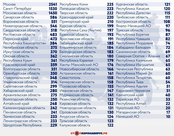 Из других субъектов Федерации по числу случаев заражения за истекшие сутки выделяются Санкт-Петербург (1530), Московская область (1450), Самарская область (586), Воронежская область (551), Нижегородская область (546), Свердловская область (518), Ростовская область (483), Пермский край (473).