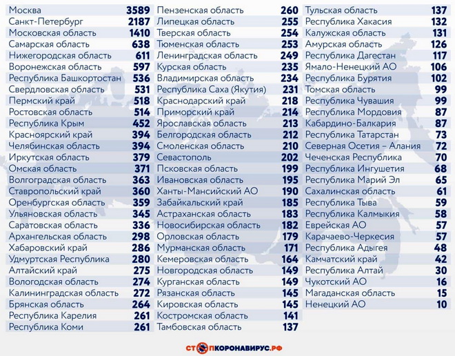 Среди иных субъектов Федерации по числу случаев заражения за последние сутки выделяются Санкт-Петербург (2187), Московская область (1410), Самарская область (638), Нижегородская область (611), Воронежская область (597), Республика Башкортостан (536), Свердловская область (531), Пермский край (518), Ростовская область (514).