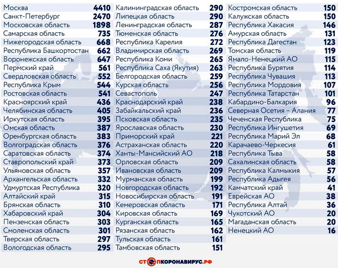 Из других субъектов Федерации по числу случаев заражения за последние сутки выделяются Санкт-Петербург (2470), Московская область (1898), Самарская область (735), Нижегородская область (668), Республика Башкортостан (662), Воронежская область (647), Пермский край (561), Свердловская область (552), Республика Крым (544), Ростовская область (541).