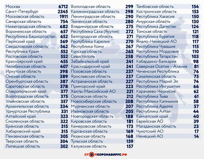 Среди других субъектов Федерации по числу случаев заражения за последние сутки лидируют Санкт-Петербург (2345), Московская область (1911), Самарская область (754), Нижегородская область (682), Воронежская область (657), Республика Башкортостан (652), Пермский край (569), Свердловская область (562), Республика Крым (552), Ростовская область (552).