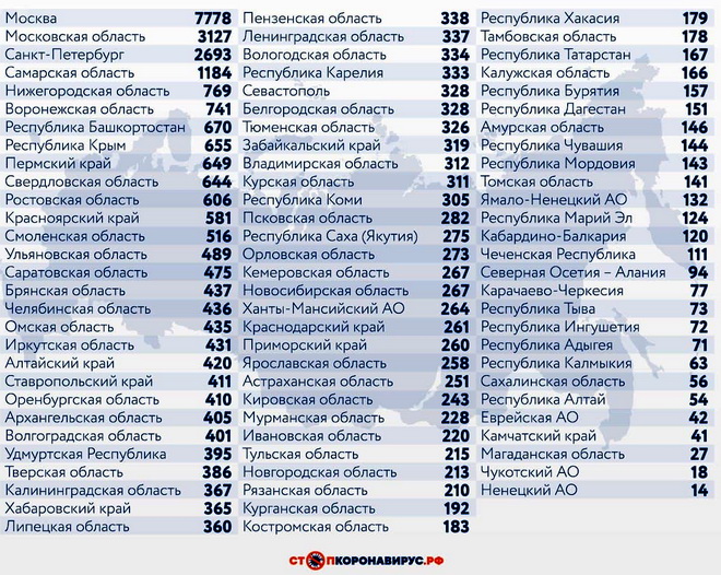 Из других субъектов Федерации по числу случаев заражения за истекшие сутки выделяются Московская область (3127), Санкт-Петербург (2693), Самарская область (1184), Нижегородская область (769), Воронежская область (741), Республика Башкортостан (670), Республика Крым (655), Пермский край (649), Свердловская область (644), Ростовская область (606), Красноярский край (581).