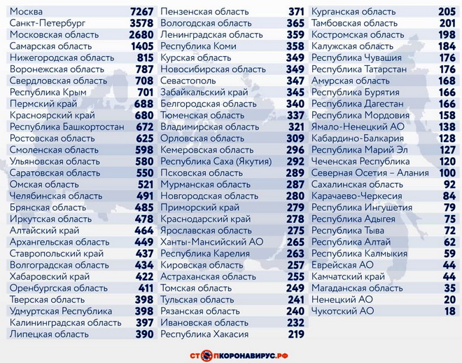 Среди других субъектов Федерации по числу случаев заражения за истекшие 24 часа лидируют Санкт-Петербург (3578), Московская область (2680), Самарская область (1405), Нижегородская область (815), Воронежская область (787), Свердловская область (708), Республика Крым (701), Пермский край (688), Красноярский край (680), Республика Башкортостан (672), Ростовская область (625).