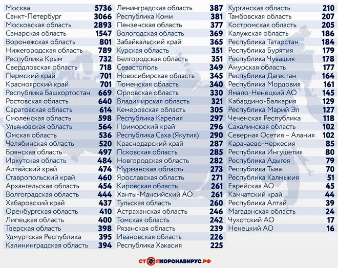 Среди других субъектов Федерации по числу случаев заражения за последние стуки лидируют Санкт-Петербург (3066), Московская область (2893), Самарская область (1547), Воронежская область (801), Нижегородская область (789), Республика Крым (732), Свердловская область (718), Пермский край (701), Красноярский край (701), Республика Башкортостан (669), Ростовская область (640), Саратовская область (614).