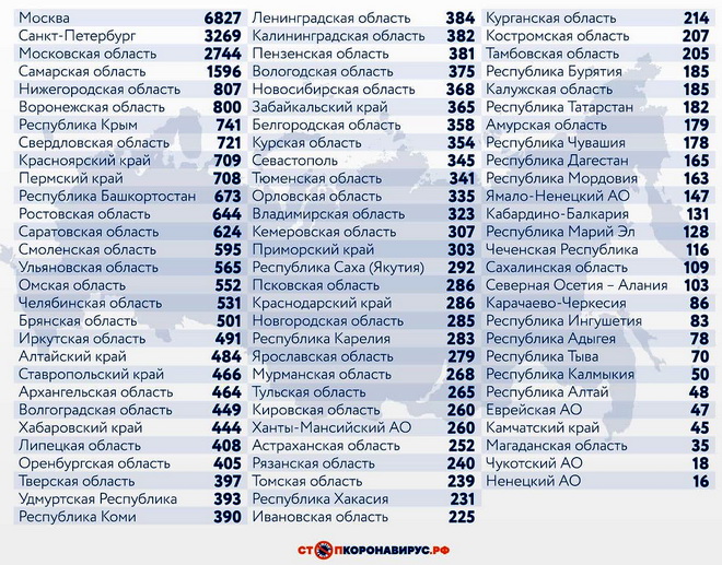 Из других субъектов Федерации по числу случаев заражения за последние стуки выделяются Санкт-Петербург (3269), Московская область (2744), Самарская область (1596), Нижегородская область (807), Воронежская область (800), Республика Крым (741), Свердловская область (721), Красноярский край (709), Пермский край (708), Республика Башкортостан (673), Ростовская область (644), Саратовская область (624).