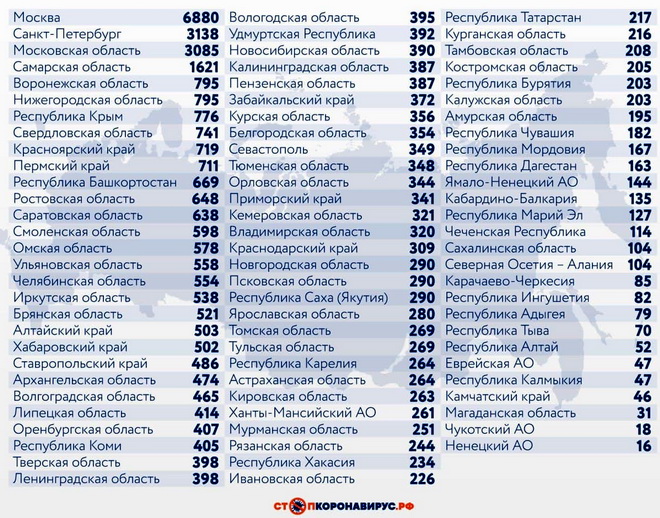 Среди других субъектов Федерации по числу случаев заражения за последние сутки лидируют Санкт-Петербург (3138), Московская область (3085), Самарская область (1621), Воронежская область (795), Нижегородская область (795), Республика Крым (776), Свердловская область (741), Красноярский край (719), Пермский край (711), Республика Башкортостан (669), Ростовская область (648), Саратовская область (638).