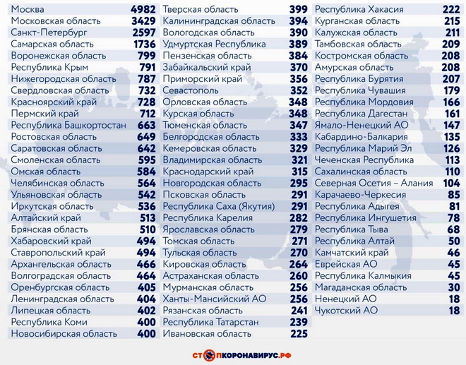 Из других субъектов Федерации по числу случаев заражения за последние сутки выделяются Московская область (3429), Санкт-Петербург (2597), Самарская область (1736), Воронежская область (799), Республика Крым (791), Нижегородская область (787), Свердловская область (732), Красноярский край (728), Пермский край (712), Республика Башкортостан (663), Ростовская область (649), Саратовская область (642).