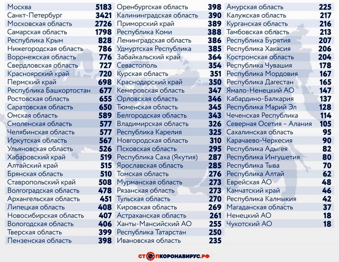 Из других субъектов Федерации по числу случаев заражения за последние 24 часа выделяются Санкт-Петербург (3421), Московская область (2726), Самарская область (1798), Республика Крым (828), Нижегородская область (786), Воронежская область (776), Свердловская область (727), Красноярский край (720), Пермский край (698).