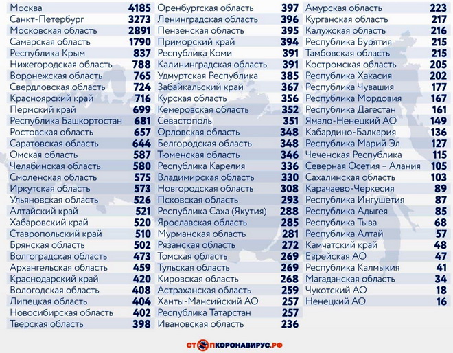 Из других субъектов Федерации по числу случаев заражения за последние 24 часа выделяются Санкт-Петербург (3273), Московская область (2891), Самарская область (1790), Республика Крым (837), Нижегородская область (788), Воронежская область (765), Свердловская область (724), Красноярский край (716), Пермский край (699).