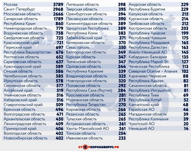 Из других субъектов Федерации по числу случаев заражения за последние сутки выделяются Санкт-Петербург (2968), Московская область (2666), Самарская область (1789), Республика Крым (860), Нижегородская область (779), Воронежская область (758), Свердловская область (725), Красноярский край (721), Пермский край (697).
