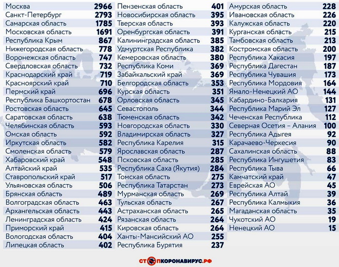 Из других субъектов Федерации по числу случаев заражения за последние сутки выделяются Санкт-Петербург (2793), Самарская область (1785), Московская область (1691), Республика Крым (867), Нижегородская область (778), Воронежская область (747), Свердловская область (732), Краснодарский край (719), Красноярский край (710), Пермский край (696).