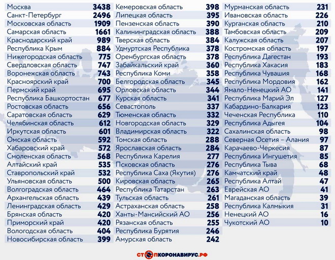Из других субъектов Федерации по числу случаев заражения за последние сутки выделяются Санкт-Петербург (2496), Московская область (1909), Самарская область (1661), Краснодарский край (989), Республика Крым (884), Нижегородская область (775), Свердловская область (747), Воронежская область (743), Красноярский край (700), Пермский край (695).