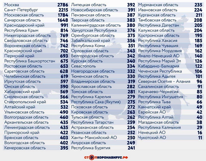 Среди иных субъектов Федерации по числу случаев заражения за последние сутки выделяются Санкт-Петербург (2215), Московская область (1784), Самарская область (1648), Краснодарский край (991), Республика Крым (814), Нижегородская область (769), Свердловская область (746), Воронежская область (742), Красноярский край (702), Пермский край (693).