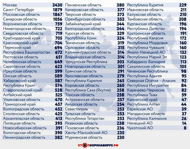 Из других субъектов Федерации по числу случаев заражения за последние сутки выделяются Санкт-Петербург (1879), Московская область (1867), Самарская область (1056), Воронежская область (759), Нижегородская область (722), Свердловская область (719), Краснодарский край (705), Красноярский край (704).