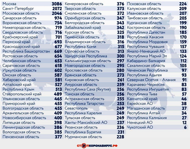 Среди других субъектов Федерации по числу случаев заражения за последние сутки выделяются Санкт-Петербург (2072), Московская область (2046), Самарская область (974), Воронежская область (754), Нижегородская область (719), Свердловская область (716), Красноярский край (701).
