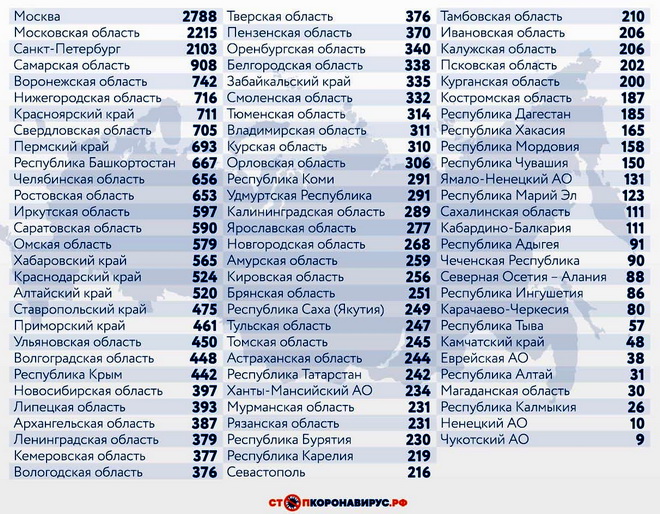 Среди других субъектов Федерации по числу случаев заражения за последние сутки выделяются Московская область (2215), Санкт-Петербург (2103), Самарская область (908), Воронежская область (742), Нижегородская область (716), Красноярский край (711), Свердловская область (705).