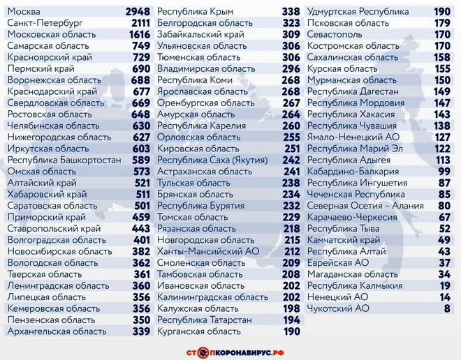 Среди прочих субъектов Федерации по числу случаев заражения за последние сутки выделяются Санкт-Петербург (2111), Московская область (1616), Самарская область (749), Красноярский край (729), Пермский край (690), Воронежская область (688), Краснодарский край (677), Свердловская область (669), Ростовская область (648).