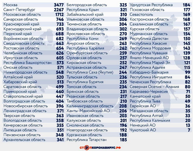 Из других субъектов Федерации по числу случаев заражения за последние 24 часа выделяются Санкт-Петербург (2267), Московская область (1712), Самарская область (746), Красноярский край (733), Краснодарский край (693), Пермский край (688), Воронежская область (682), Свердловская область (663), Ростовская область (654).