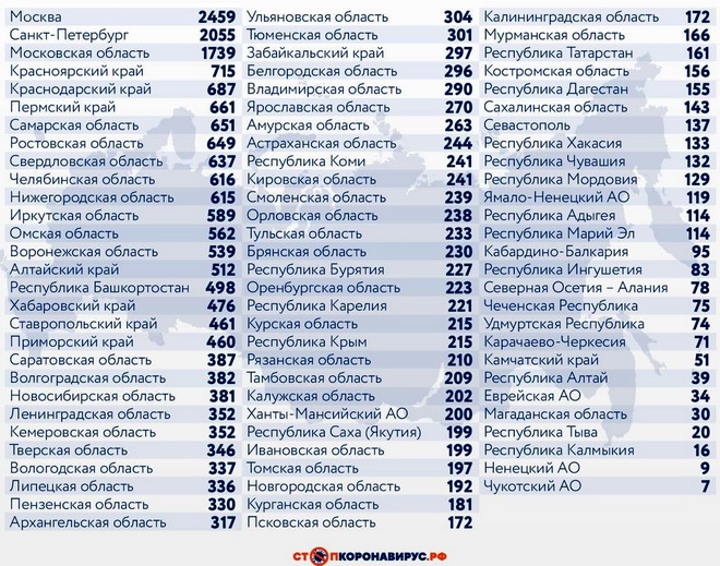 Среди других субъектов Федерации по количеству случаев заражения за последние 24 часа лидируют Санкт-Петербург (2055), Московская область (1739), Красноярский край (715), Краснодарский край (687), Пермский край (661), Самарская область (651), Ростовская область (649).