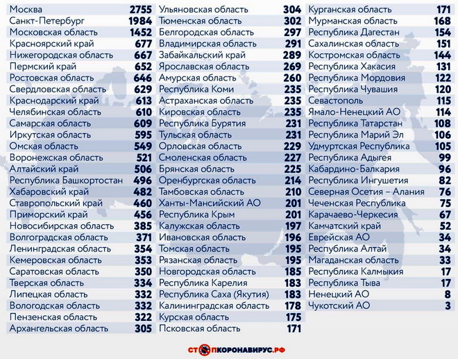 Среди других субъектов Федерации по количеству случаев заражения за последние 24 часа выделяются Санкт-Петербург (1984), Московская область (1452), Красноярский край (677), Нижегородская область (667), Пермский край (652), Ростовская область (646).