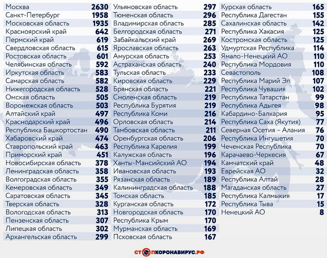 Из иных субъектов Федерации по числу случаев заражения за последние 24 часа обращают на себя внимание Санкт-Петербург (1958), Московская область (1935), Красноярский край (642), Пермский край (619), Свердловская область (615), Ростовская область (601).