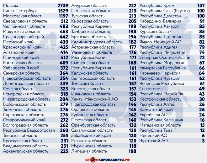 Из других субъектов Федерации по числу случаев заражения коронавирусной инфекцией за последние сутки выделяются Санкт-Петербург (1529) и Московская область (1197).