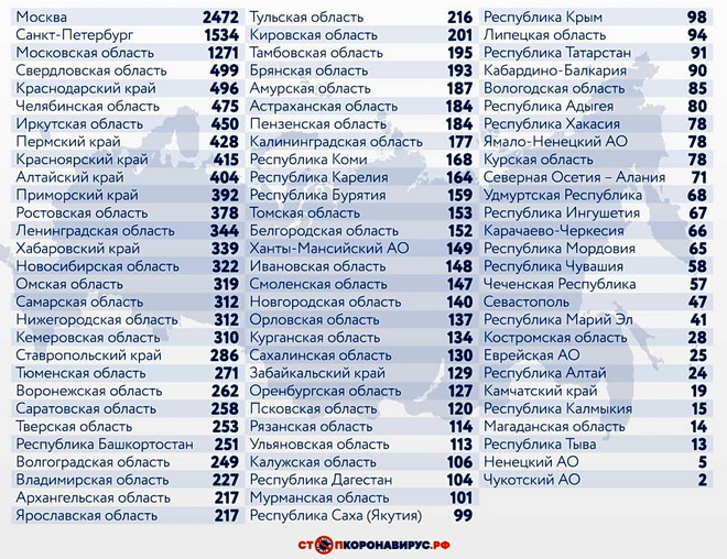 Среди иных субъектов Федерации по числу случаев заражения коронавирусной инфекцией за последние 24 часа выделяются Санкт-Петербург (1534) и Московская область (1271).