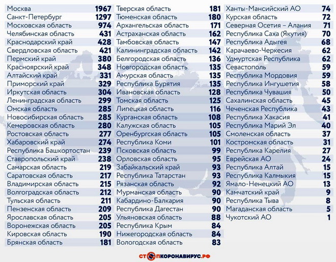 Из других субъектов Федерации по числу случаев заражения коронавирусной инфекцией за последние 24 часа выделяются Санкт-Петербург (1297) и Московская область (974).