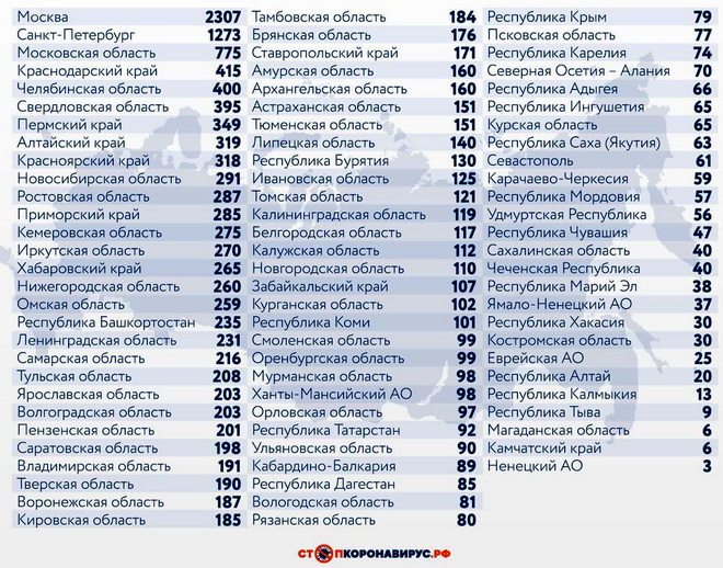 Среди других субъектов Федерации по числу случаев заражения коронавирусной инфекцией за последние сутки выделяются Санкт-Петербург (1273) и Московская область (775).