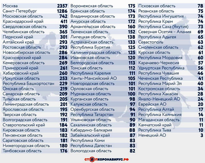 Из других субъектов Федерации по числу случаев заражения коронавирусной инфекцией за последние 24 часа выделяются Санкт-Петербург (1286) и Московская область (742).