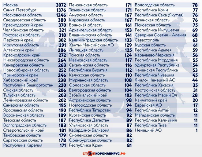Среди других субъектов Федерации по числу случаев заражения коронавирусной инфекцией за последние сутки выделяются Санкт-Петербург (1376) и Московская область (1246).
