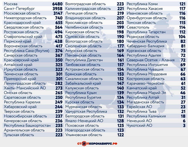 Среди других субъектов Федерации по числу случаев заражения ковидом за истекшие сутки выделяются Санкт-Петербург (3958) и Московская область (3147).