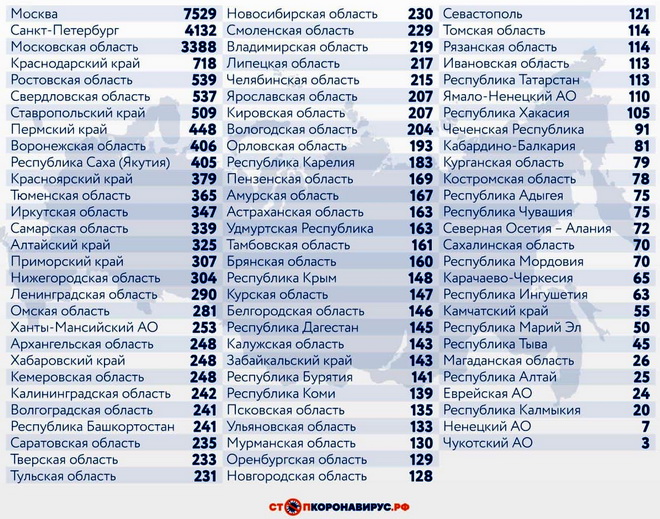 Из других субъектов Федерации по числу случаев заражения ковидом за последние 24 часа выделяются Санкт-Петербург (4132) и Московская область (3388).