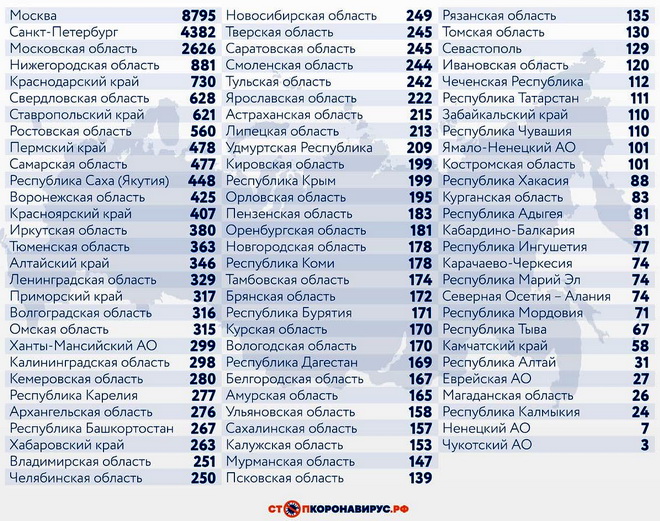 Из других субъектов Федерации по числу случаев заражения ковидом за последние 24 часа выделяются Санкт-Петербург (4382) и Московская область (2626).