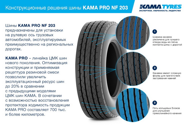 ЦМК шины нового поколения КАМА PRO NT 203 устанавливаются на колёса прицепов и полуприцепов грузовых автомобилей, которые используются в перевозках между регионами. Изменения в конструкции шины помогли увеличить срок эксплуатации. Был использован новый рецепт резиновой смеси. Срок службы был продлён на 20% по сравнению с предыдущими моделями. Новые шины выдерживают повышенные нагрузки – до 5000 кг. Рисунок поверхности позволяет отводить влагу из пятна контакта шины с дорогой, удалять мелкие камни. Все это увеличивает ресурс шины.