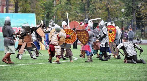 Затем почетные гости и хозяева праздника заняли свои места на трибунах и началось театрализованное представление. Здесь были и народные гуляния, и бой русских воинов с татарами, и зарисовки из петровской эпохи, и наглядные сценки из жизни Боброва послевоенного времени.