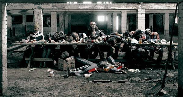 На фотографии, которая вызвала возмущение верующих, изображена группа из 12 мужчин после попойки. Работа откровенно пародирует «Тайную вечерю».