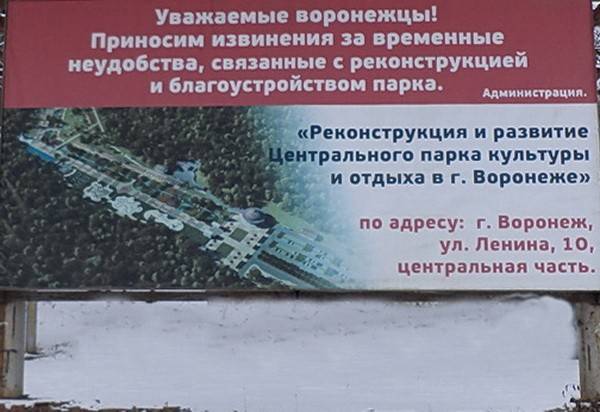 Как раз накануне мэрия Воронежа отрапортовала об установке в парке щитов, информирующих воронежцев о продолжающихся работах по его реконструкции. Чиновники администрации просили воронежцев проявить понимание и, в частности, не кататься с Пионерской горки.