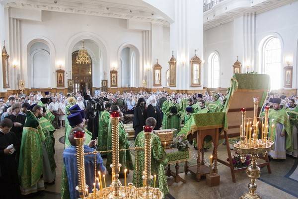 Под пение молитв мощи были внесены под своды собора, наполненного верующими. На середине храма для ковчега и украшенной бисером иконы были приготовлены резной столик и аналой, украшенные живыми цветами.