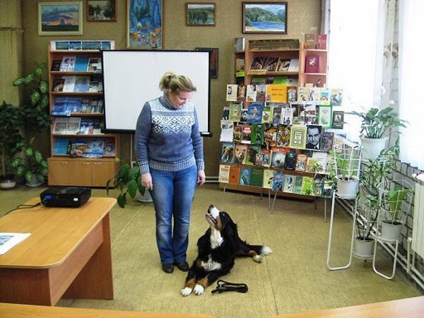 На следующий день в гости пришла учитель физики Надежда Лобова с бернским зинненхундом Гердой. Герда – чемпионка России, ей 5 лет. Хозяйка рассказала о том, как важно серьёзно относиться к выбору породы собаки, соизмерять свои возможности, как моральные, так и материальные, подходить с большой ответственностью к воспитанию четвероного друга. Герда восхитила всех своим умом, сообразительностью, взаимопониманием с хозяйкой, продемонстрировала навыки, полученные в ходе обучения: выполнение команд «Ко мне», «Лежать», «Место», «Лапу», «Охраняй», а с командой «Тапочки» вышла история, повеселившая всех от души. Герда отказывалась приносить хозяйке тапочки одной из наших сотрудниц, вместо них она несла поводок. Пришлось Надежде Дмитриевне переобуться, и Герда с радостью принесла хозяйские ботинки, а чужие тапочки ей были не нужны!