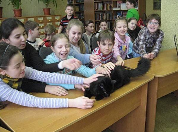 А ещё через день на встречу со школьниками 4-ых классов пришли владельцы антикафе «Mr.moore» Анастасия Пешкова и Иван Горбунов. С собой они принесли кота Блэка, одного из 18-ти котов, живущих в кафе. Кот Блэк сразу же попал в объятия детей, его передавали из рук в руки, гладили, тискали, обнимали, а Блэк от такого внимания только млел. Он быстро освоился, стал гулять по библиотеке, знакомиться с окружающими.