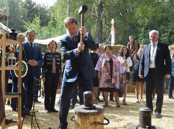 Особое место в экспозиции заняли «Красная слобода» и киносъемочная площадка из соломы, созданные под руководством начальника отдела культуры Воробьёвского района Василия Козлова. Глава региона выковал себе на память монетку с изображением линкора «Гото Предестинация», внимательно осмотрел ряды с изделиями ремесленников.