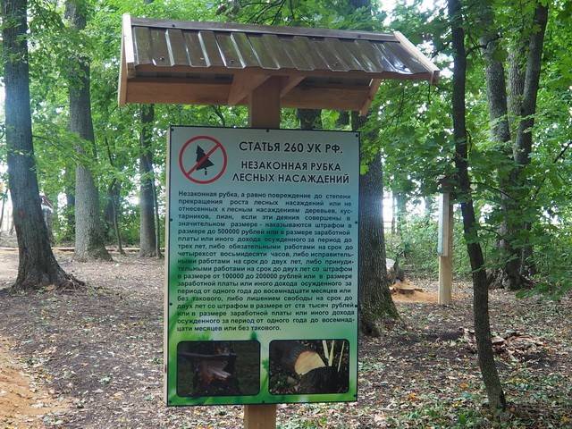 Прогуливаясь по экологической тропе, можно не только наслаждаться свежим и чистым воздухом, но и узнать много нового. По всему периметру расставлены таблички с указами Петра I по охране и защите леса, а уже на обратном пути, как следствие, статьи УК РФ.