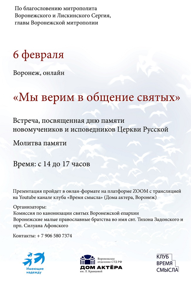 В субботу, 6 февраля, накануне Дня памяти новомучеников и исповедников Церкви Русской, по благословению митрополита Воронежского и Лискинского Сергия в Воронеже будет отслужена панихида, а также состоится памятная встреча «Мы верим в общение святых».