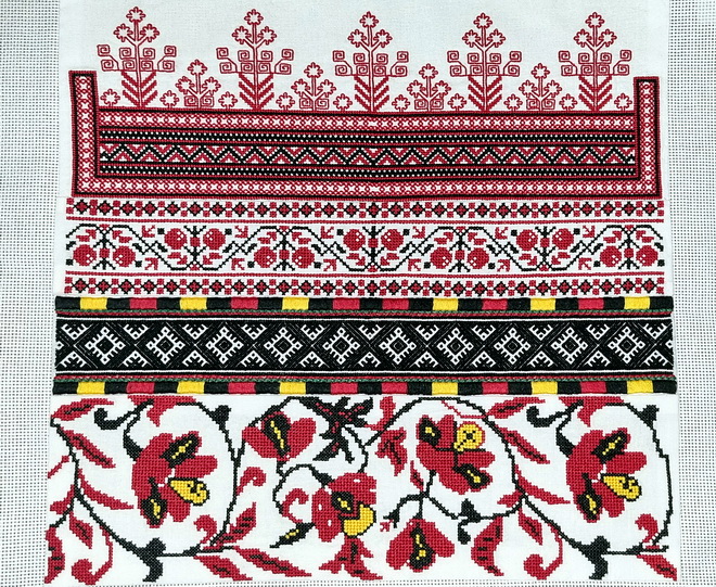 Русскую вышивку представляет орнамент села Татарино Каменского района Воронежской области. Вышивка выполнена в технике «счётная гладь». Особенностью вышивки является то, что с изнаночной стороны рисунок абсолютно точно повторяется, как на лицевой стороне. Такой вышивкой украшали женские фартуки. Узор символизирует засеянное поле, пышную растительность и богатый урожай.