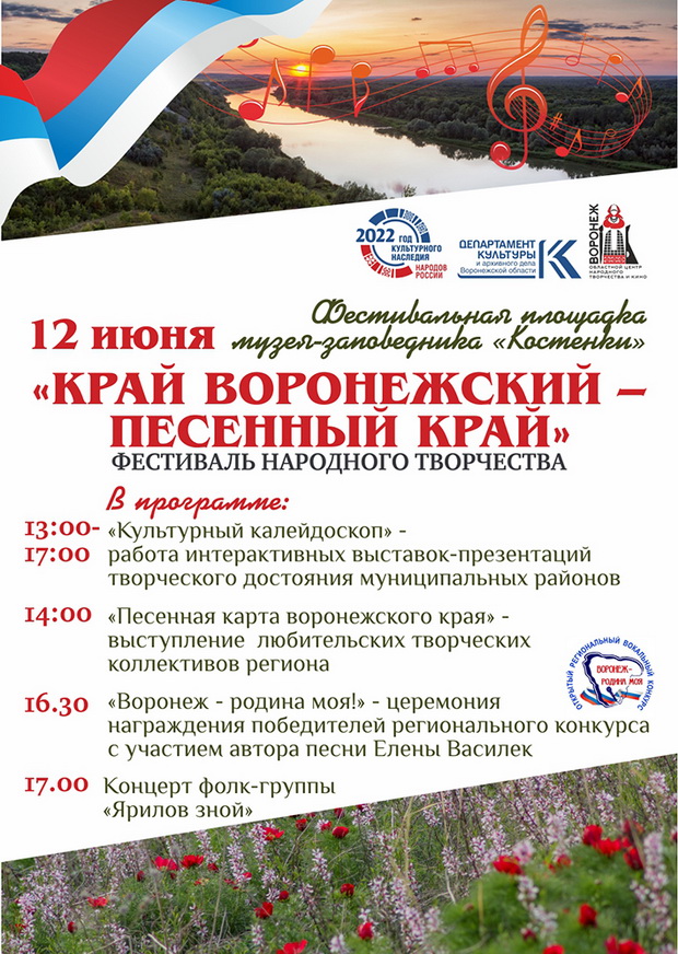 Впервые в День России, 12 июня, в селе Костёнки Хохольского района пройдёт фестиваль народного творчества «Край воронежский – песенный край». Крупномасштабный проект, организованный Воронежским областным центром народного творчества и кино при поддержке департамента культуры Воронежской области, представит уникальное песенное наследие региона.