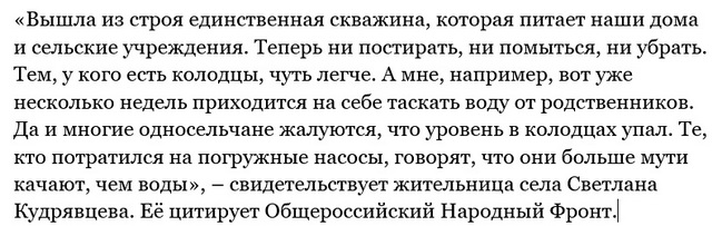 А вот подвоз питьевой воды в селе не организован. И никто не говорит людям, когда закончится этот ад на земле. Власти ничего конкретного не обещают, сроков не называют. По домам ходят слухи. «Неужели так сложно собрать сход и все объяснить?», – недоумевает руководитель регионального исполкома Народного фронта в Воронежской области Александр Гончаров.