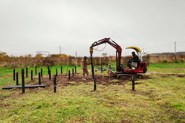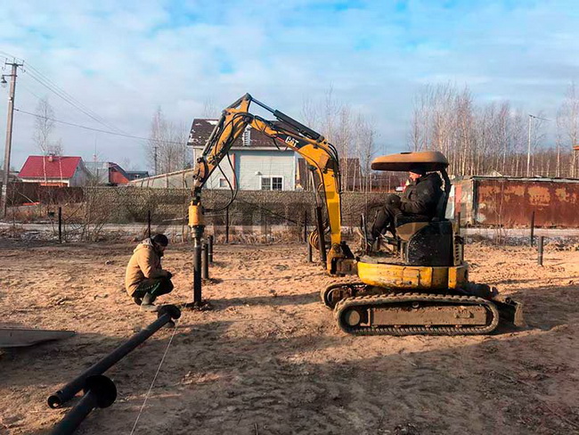 • Спецтехникой. Для этого используют мини-экскаватор с насадкой (ямобур), который может работать в условиях плотной застройки, обладает высокой точностью установки, не требует специальных подъездных путей. Механизированный способ востребован при монтаже крупных столбов в большом количестве, а также при работе на почвах с высокой плотностью.