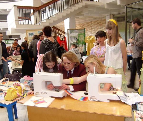 В этот момент председателя областного родительского комитета уносит водоворот воспитанников и преподавателей знаменитой Воронежской «Реальной школы» по главе с директором, народным учителем России Альбиной Золотаревой. Татьяна Шнайдер с удовольствием общается с «реалистами», осматривает их работы, сама садится за швейную машинку – не муляж ли? Все по настоящему. Хоть сейчас шей костюмы – как вот эти, созданные руками ребят к 425-летию Воронежа.