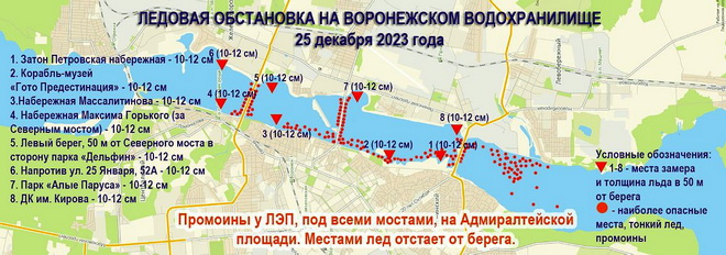 Правительство региона распространило сводку о ледовой обстановке на Воронежском водохранилище. Была измерена толщина льда и составлена карта с указанием самых опасных локаций.