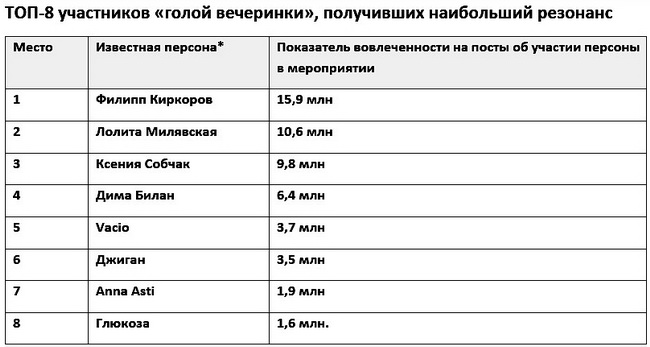 Компания КРОС провела оперативное исследование реакции пользователей социальных сетей на скандал в связи с «голой вечеринкой» в клубе «Мутабор» и выяснила, что наибольший резонанс вызывало участие в ней Филиппа Киркорова. На втором месте оказалась Лолита Милявская, на третьем — Ксения Собчак.